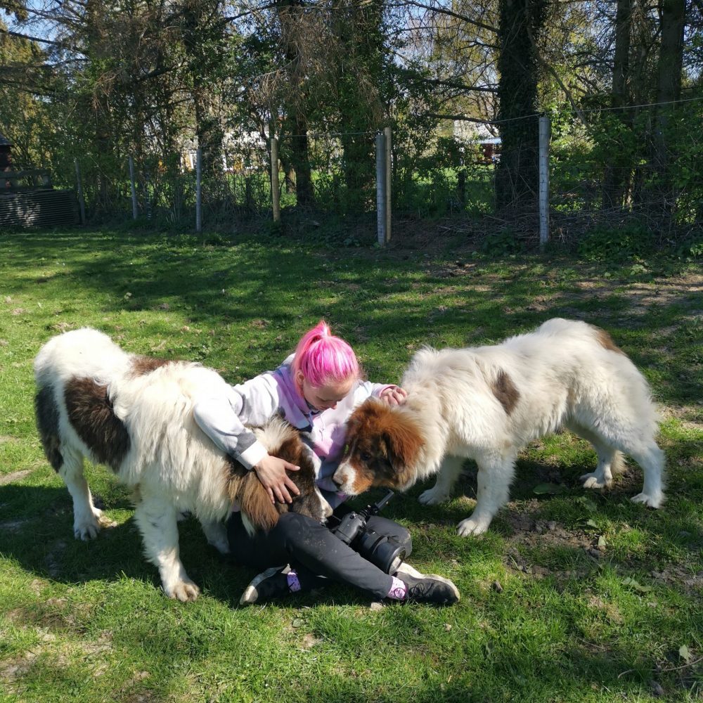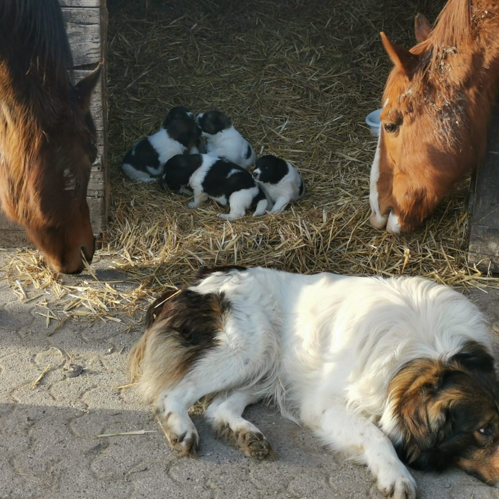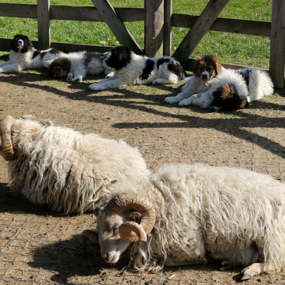 Die Welpen werden im Stall auf Stroh und Schafwolle geboren wobei neben der Mutter auch die anderen Hunde des Rudels Zugang zum Wurfbereich, einer abgeteilten Pferdebox, haben. Die Herdentiere haben aufgrund der Verletzlichkeit der Welpen anfangs noch keinen direkten Kontakt zu den Kleinen, können aber über halbhohe Abtrennungen bereits in den Wurfbereich schauen und herein schnuppern. Und auch wenn die Welpen selbst zu Beginn noch weder sehen noch hören können so nehmen sie doch bereits alle sie umgebenden Gerüche auf. Sobald sie die Augen geöffnet haben und die ersten Schritte machen dürfen sie zusammen mit ihrer Mutter unter Aufsicht bereits den sicheren Stall verlassen und erste zarte Kontakte knüpfen. Sind sie dann sicher auf den Beinen sind wird ein Welpenschlupf eingerichtet, so dass sie frei entscheiden können, wo sie sich aufhalten und wann sie sich lieber zurückziehen. So werden sie von Geburt an optimal auf die Herde geprägt und werden beim Verlassen des Wurfbereichs dann sowohl von mir als auch von ihrer Mutter und den anderen Hunden in ihrem Verhalten angeleitet und wenn nötig korrigiert.